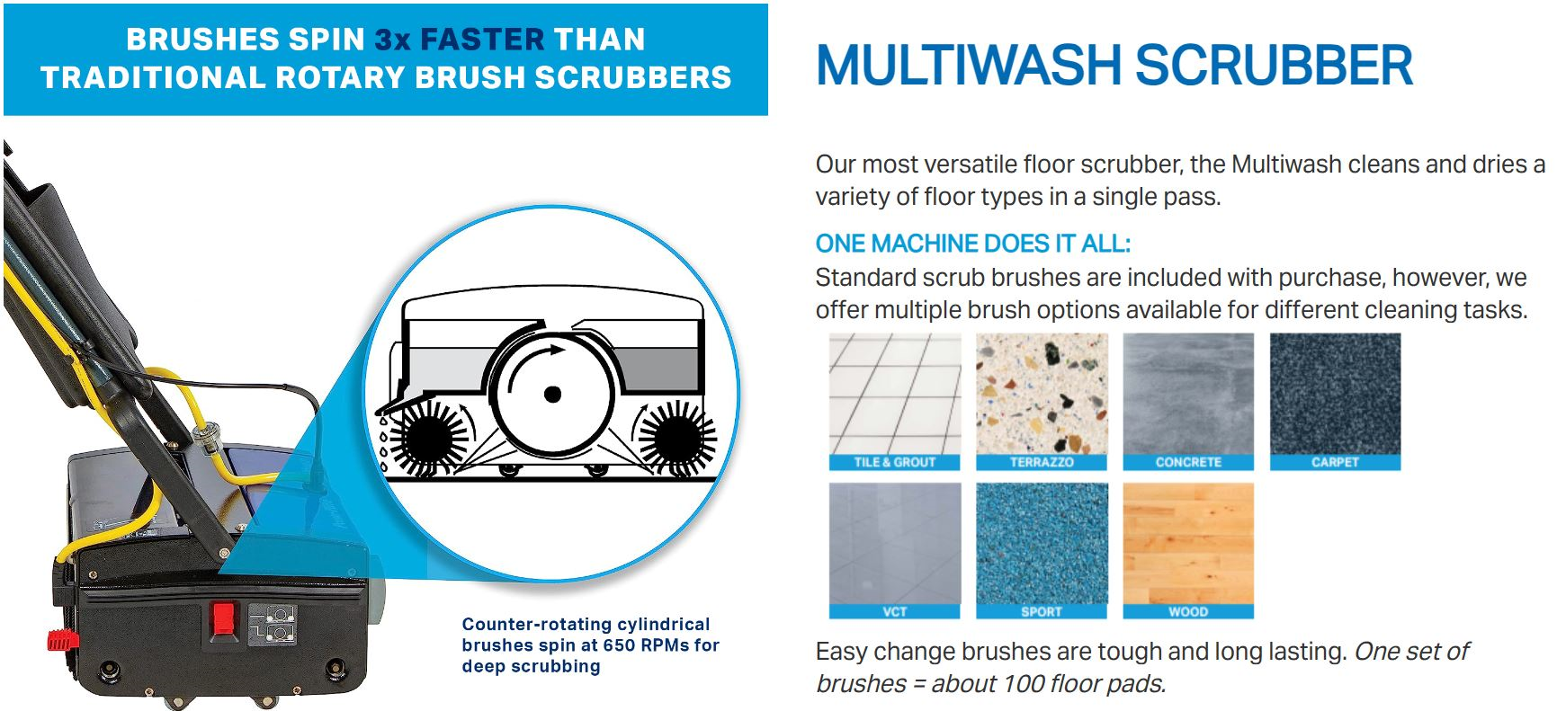 The Multiwash offers quiet, high quality cleaning performance, versatility, ease of use and durability. This machine will wash, mop, scrub and dry in a single pass on virtually every kind of floors. The Multiwash can even be used on escalators and entrance matting.