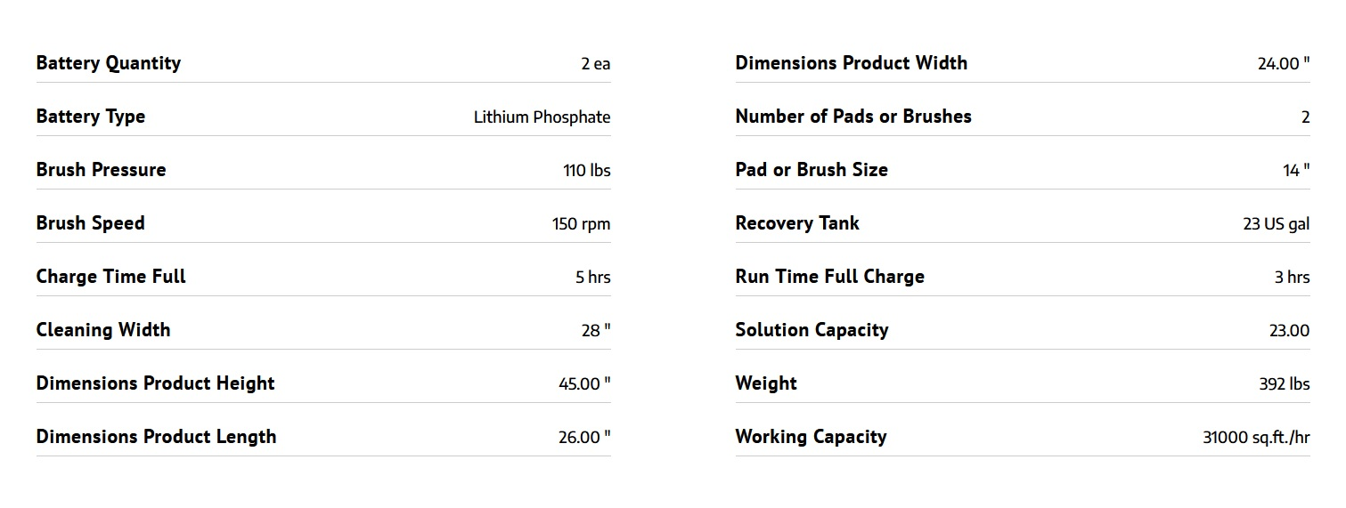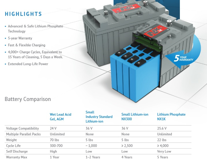 2 NX1K Batteries (maintenance free), Pad Drivers, Squeegee Assembly, Owner's Guide, and 2-Year Warranty on Parts & Paid Labor