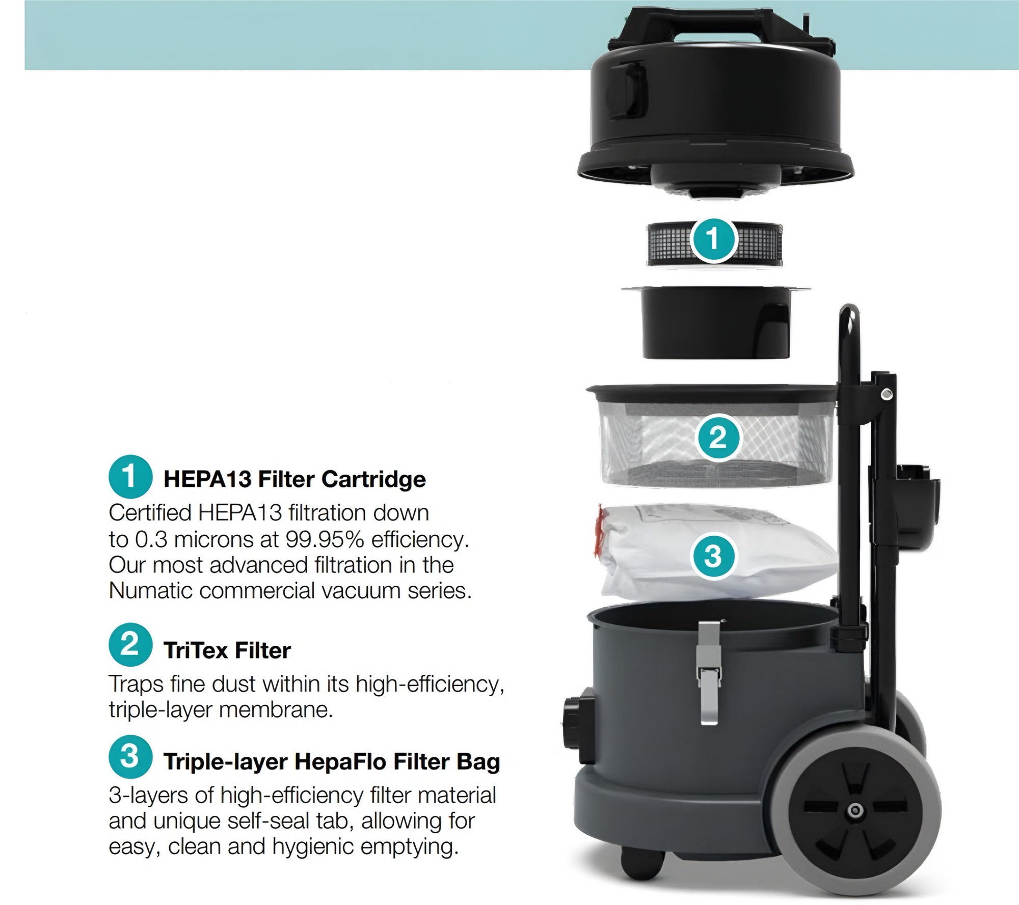 390H TradeLine Series of Advanced HEPA Filtration vacuums are European certified guaranteeing minimum filtration levels of 99.97% @ 0.3 microns.