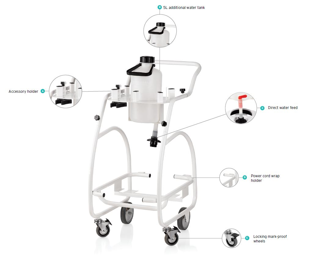 For easier mobility and storage, our trolley includes direct water feed and non-skid wheels.