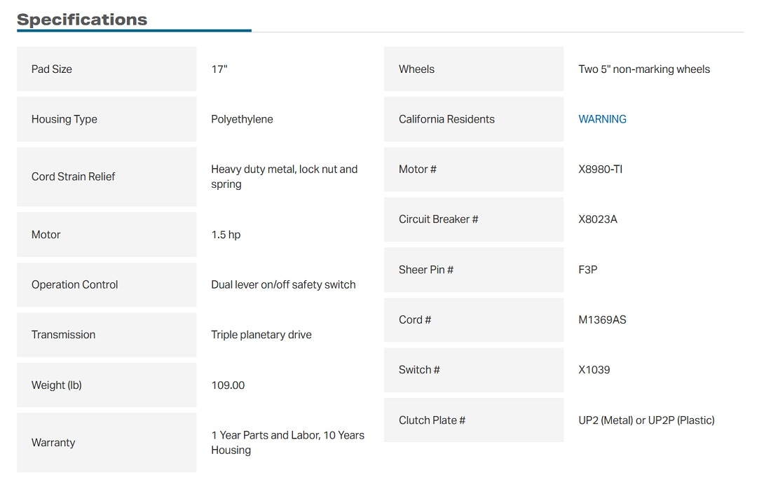 NM171HD Power-Flite 17" Millennium floor machine 1.5 hp 175 RPM w/50' power cord