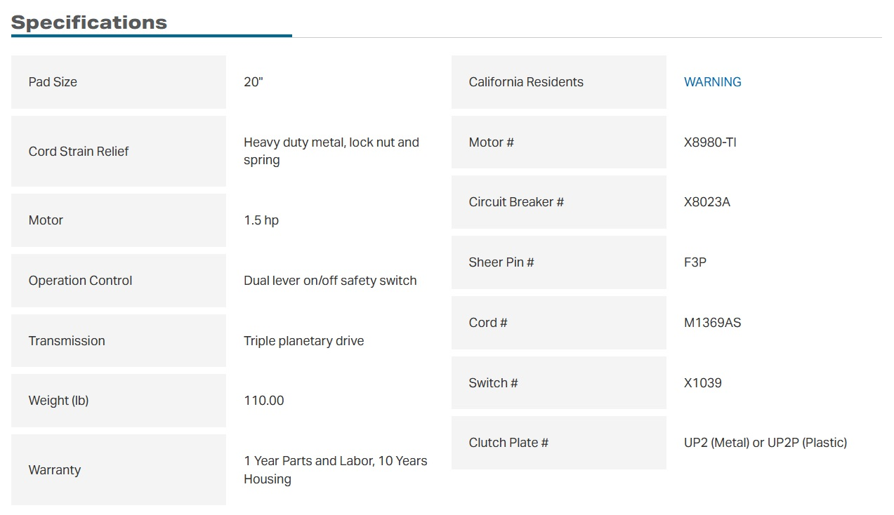 20" 1.5 hp Millennium Edition Floor Machine provides the power and versatility for the toughest jobs and features a patented rotationally molded one-piece housing that reduces the vibration and torque commonly found in other floor machines.