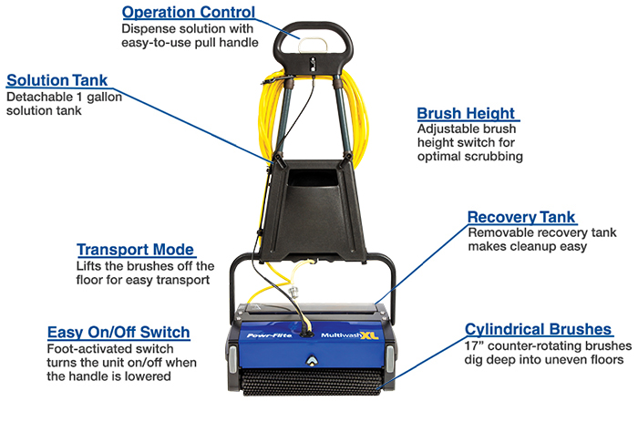 The PFMW18 Multiwash XL offers quiet, high quality cleaning performance, versatility, ease of use and durability. This machine will wash, mop, scrub and dry in a single pass on virtually every kind of floor.
