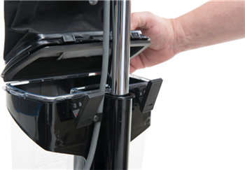 Dust Cup Uprights come with the Easy Release Dust Cup. Simply release the latches, pivot the upper bag back, and pull out the dust cup to empty.